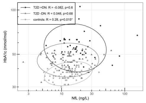 Figure 2. Spearman correlation between NfL(ng/L) and HbA1c (mmol/L), Ellipses illustrate 95 CI. Included groups are T2D +DPN, T2D –DPN and controls.