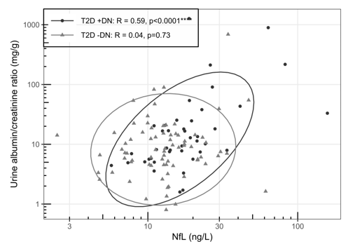 Figure 3. Spearman correlation between NfL(ng/L) and Urine albumin-creatinine ratio (mg/g). Ellipses illustrate 95 CI. Included groups are T2D +DPN and T2D –DPN, controls – no data.