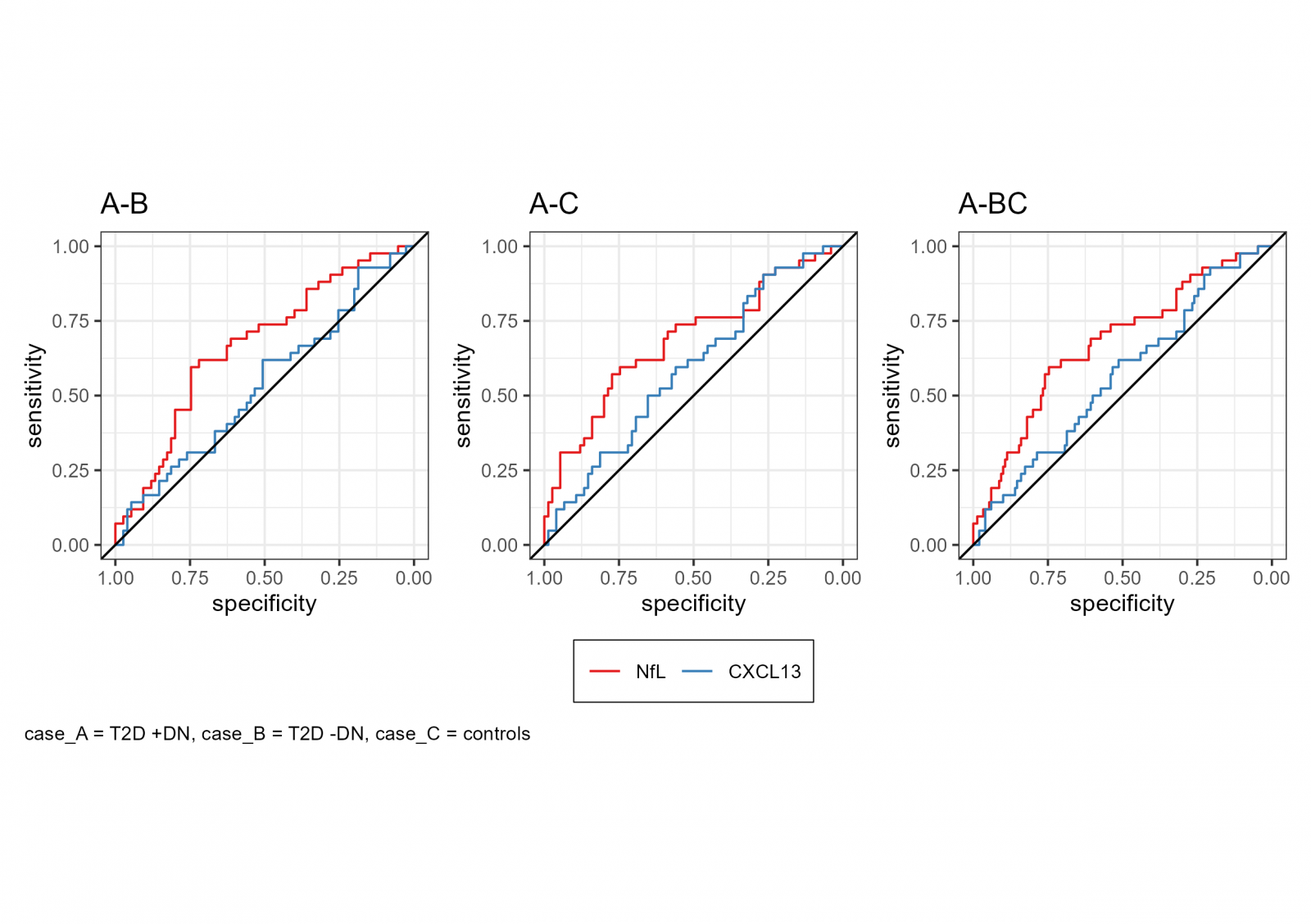 With this study, we aimed to assess the biomarker potential of both NfL and CXCL13 as detection markers for DPN in patients with T2D. To our knowledge, this is the first study to investigate CXCL13 in this context.