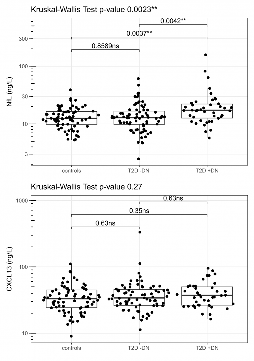 For NfL, a statistically significant difference was observed between the groups (Kruskal-Wallis test, p = 0.0023). Post hoc analysis revealed significantly higher NfL levels in the T2D + DPN group compared to both the T2D - DPN group (p = 0.0042) and the control group (p = 0.0037). No significant difference was observed between the T2D -DPN group and controls. In contrast, CXCL13 levels did not differ significantly between the groups (Kruskal-Wallis test, p = 0.27).